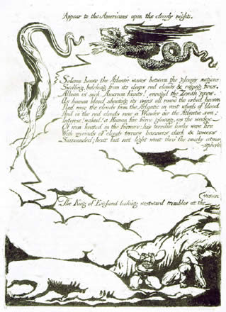 [Click on image to enlarge]: America a Prophecy, plate 4 Looking back to his early radical years from his conservative middle age, the English poet Robert Southey (1774–1843) declared that