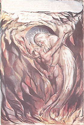 [Click on image to enlarge]: America a Prophecy, plate 6 William Blake's America, connecting recent American history with current events in France, is dated 1793 but was drafted and revised over a period of several years. The speaker in plates 6 and 7 in the extract here is "Albion's Angel," a representation of the tyrant King George III, an advocate of Urizen, who is misconceived as the God of prohibition and oppression. The opponent of Urizen is Orc, "a figure who struggles against political oppression, sexual repression, and all rational constrictions and restrictions on energy." >>(The text is from Mary Lynn Johnson and John E. Grant, eds., Blake's Poetry and Designs (New York: Norton, 1979), p. 103.) In Europe: A Prophecy (1794), Orc, with a blare of the seventh trumpet of the Book of Revelation, descends into "vineyards of red France" to herald the day when the earth and its inhabitants will be resurrected in a burst of unbounded and lustful energy.