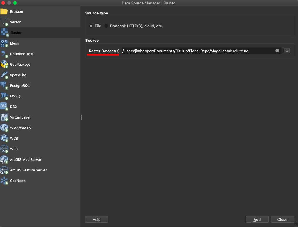 To import the .nc file into QGIS, go to Layers > Add Layer > Add Raster Layer. Once there, click on the three dots next to “Raster Database(s)” to navigate to your file. Then, click “Add.”