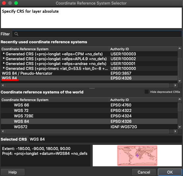 Next, a window asking for you to choose a CRS (coordinate reference system) may appear. If prompted, be sure to select WGS 84, then click OK.