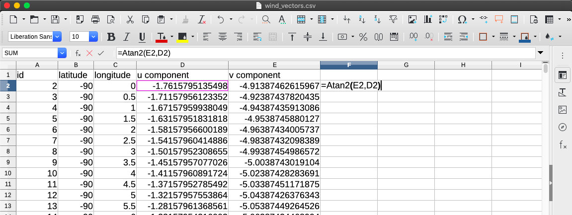 So what do we need to do? Take the u-component and divide it by the v-component. Or let the spreadsheet editor do it for us with a formula. This will give us the value of the angle, or the direction of the wind vector.