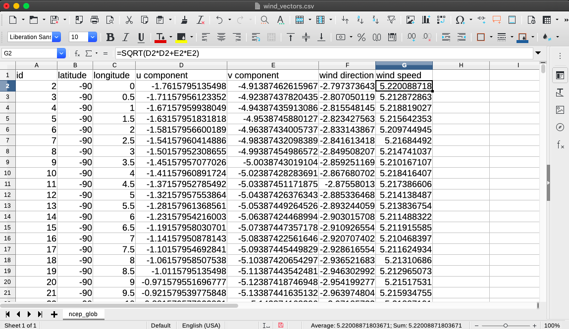 As such, we can use another spreadsheet formula, SQRT(), to do the calculation for us. = SQRT( u-component * u-component + v-component * v-component).
