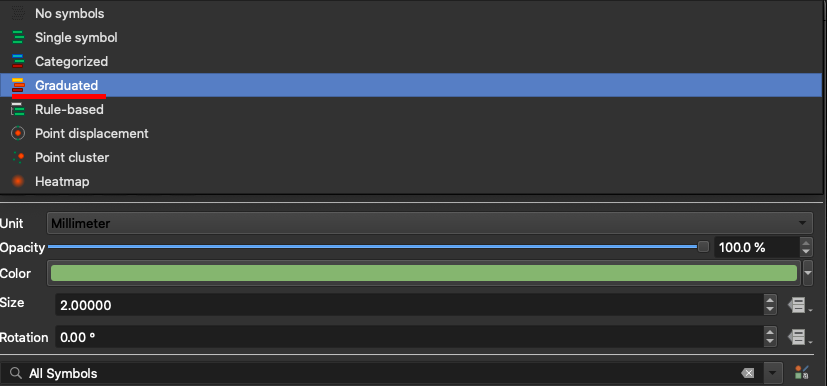 Click on “Single Symbol” at the top of the window and select “Graduated” from the resulting menu.
