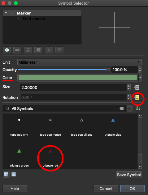 Next, click “Change…” next to “Symbol”. The Symbol Selector window should appear. Scroll down to the bottom of the symbol menu and select the “triangle red” symbol. Make sure that this is a "Font Marker," you may need to click on "Simple Marker" and then select "Font Marker" from the dropdown menu next to "Symbol Type." Then, click on the square on the far right-hand side of the window opposite “Rotation”, hover over “Field Type: int, double, string” and select “wind direction” (or whatever you named the wind direction column) from the resulting menu. This means that the directions of the symbols will be altered by this column.
