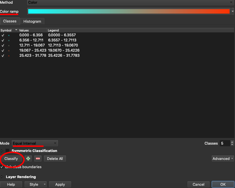 Then, make sure that the “Mode” is “Equal Interval.” Then click on the “Classify” button. You should see several symbols of different colors - according to the color ramp you chose - pop up in the menu, along with value ranges.