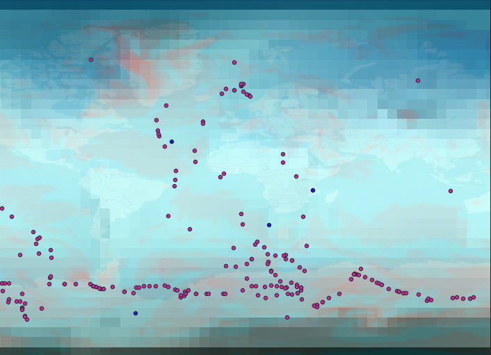 The map should now look something like the following. On my map, the pink dots are the Pacific Project data points, and the blue points are the Magellan data points. There is no apparent “magellan_desc” layer visible on the map because that layer does not contain geocoordinates of any sort.