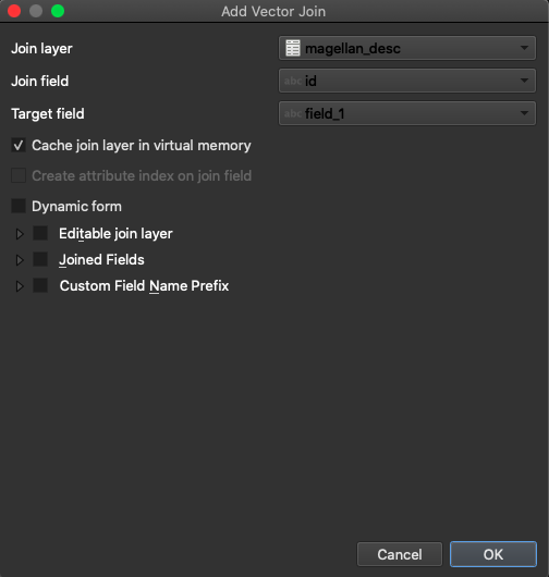 In the “Add Vector Join” window, select “magellan_desc” as the “Join Layer”. The “Join Field” should be “id” - the name of the column of IDs in the “magellan_desc.csv” file. The “Target Field” should be “field_1”, the column of IDs in the “magellan.csv” file. Then click “Ok.”