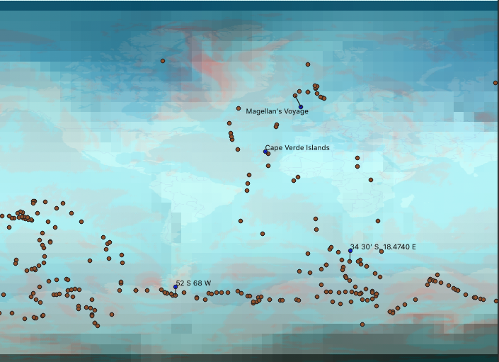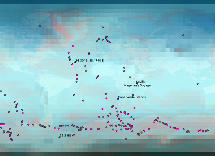 All of these seafarers were affected by the weather patterns in the ocean they travelled, and so, with this assignment, you’ll look at where the points the voyagers described in their logs stack up next to global oceanic weather patterns, sea surface temperature and wind speed. Furthermore, you’ll look how the points described in logs by the later voyagers Cook and Forster compare to points described in logs by Magellan and see how spatially similar the voyages were to each other with nearest-neighbor analysis.