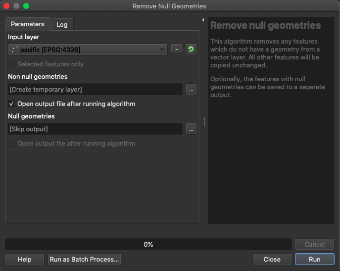 The “Remove Null Geometries” window should appear. Select “pacific” as the “Input layer,” and then click “Run.” The “Log” should then appear, and the progress of the process will be indicated by the status bar at the bottom of the window. When the process is finished, you can close the window.