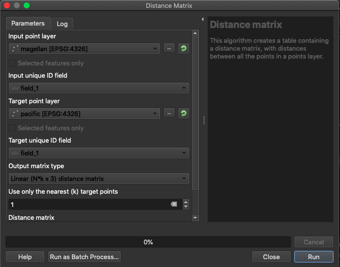 In the Distance Matrix window, select “magellan” as the “Input point layer,” “field_1” as the “Input unique ID field,” “pacific” as the “Target point layer,” and “field_1” as the “Target unique ID field.” Then, ensure that the output matrix type is a Linear (N*k x 3) distance matrix, and that 1 is in the box beneath “Use only the nearest (k) target points,” which means that only the nearest neighbor will be produced in the output. Click “Run,” when finished, and then wait for the process to finish before closing the window.