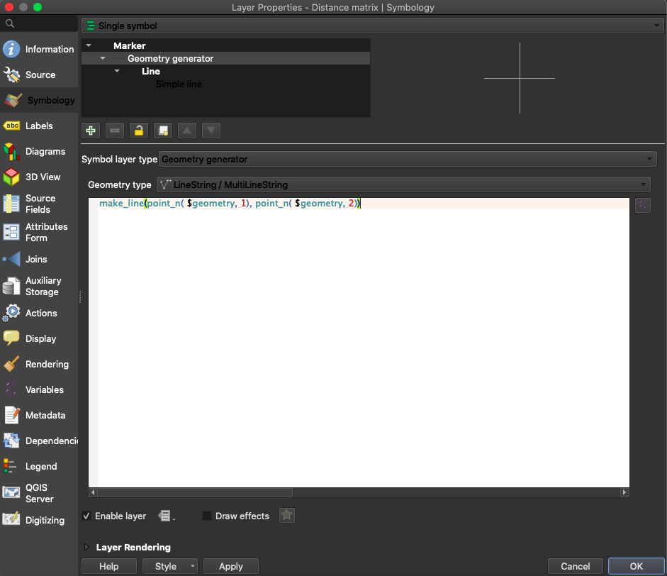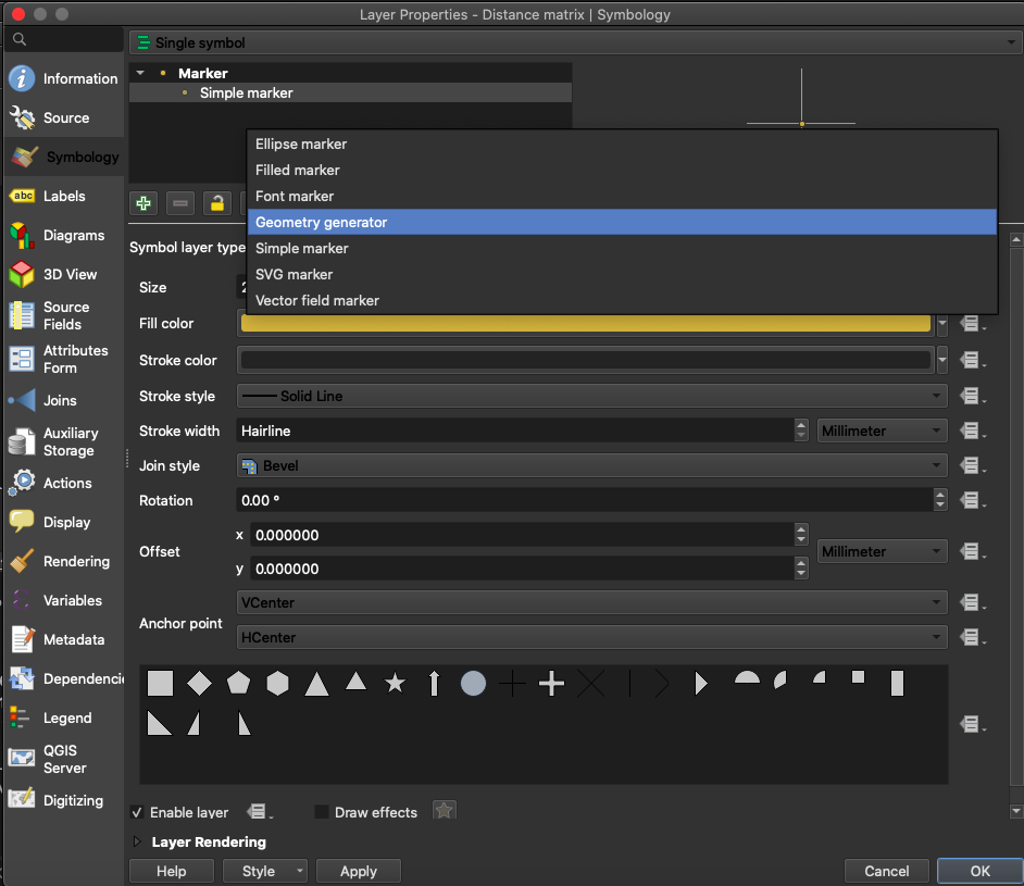 Go to the Symbology tab. Click on “Simple marker,” beneath “Marker.” Then, click on the “Symbol layer type” menu and select “Geometry generator.”